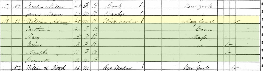 Five years later, William, Parthenia, and Martha Adams are recorded in Brooklyn. William was working as a “plasterer.”[14]