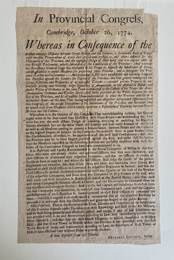 Companies of Local Militia, Cambridge, October 26, 1774. Stone House Museum Archives, Box 91 (Acts and Resolves). (Also digitized by the State Library of Massachusetts here.)