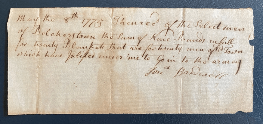 Belchertown responded by organizing a military company under the command of Captain Caleb Clark at a meeting on November 7th. In these and further deliberations that winter, town officials sorted out how to ensure Belchertown’s supply of ammunition. In February, Belchertown appointed its first Committee of Safety, one of many such local bodies across the colonies charged with broad wartime decision making. Then in April 1775, immediately after the “shots heard round the world” in Lexington and Concord, Belchertown started sending men east: dozens of names of Belchertown men appear in the lists of several companies that marched that April and May. Alongside their service we can find record of our town’s actions to support its soldiers, such as this early receipt from Jonathan Bardwell to the Selectmen on May 8th. Bardwell, captain of a company that marched on April 20th to Cambridge, acknowledged receipt of nine pounds used to purchase twenty blankets for twenty Belchertown men.