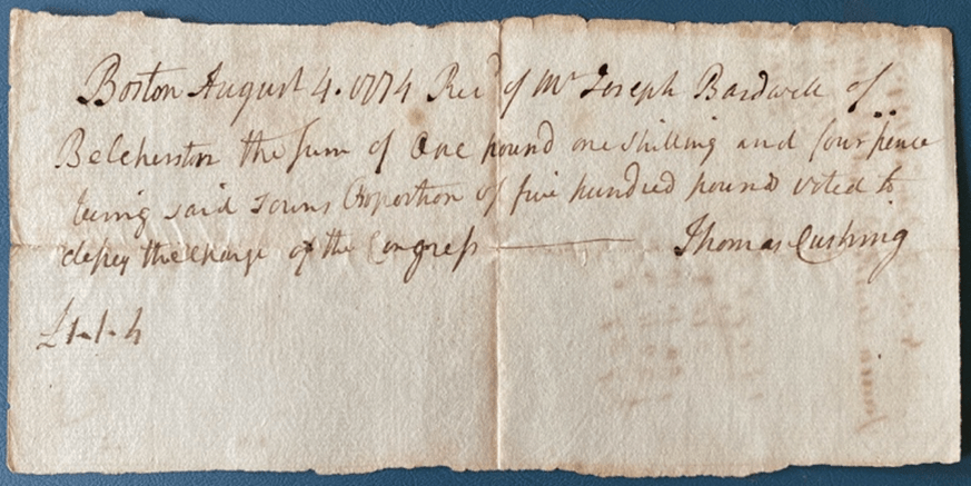 Belchertown’s proportion? According to a receipt signed by Thomas Cushing on August 4th, 1774, Joseph Bardwell paid “the sum of one pound one shilling and four pence”—that amount being Belchertown’s “Proportion of five hundred pounds voted to defray the charge of the Congress.”
